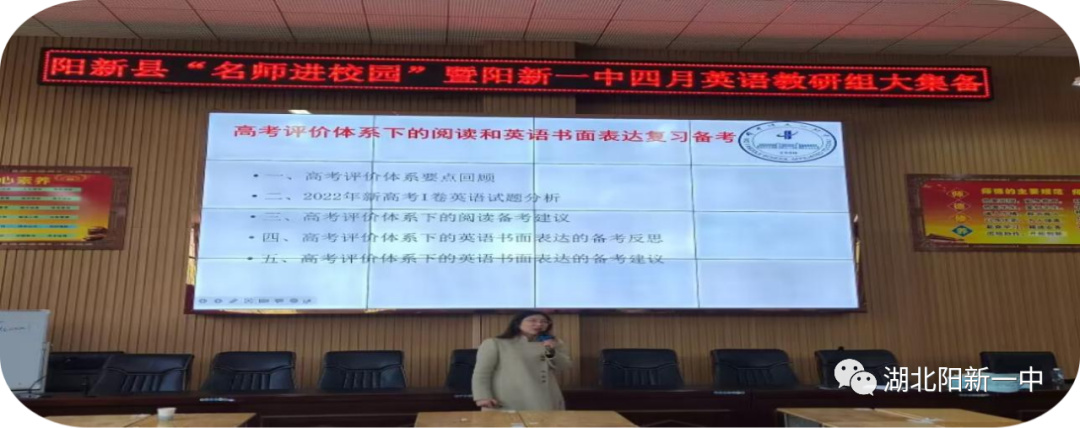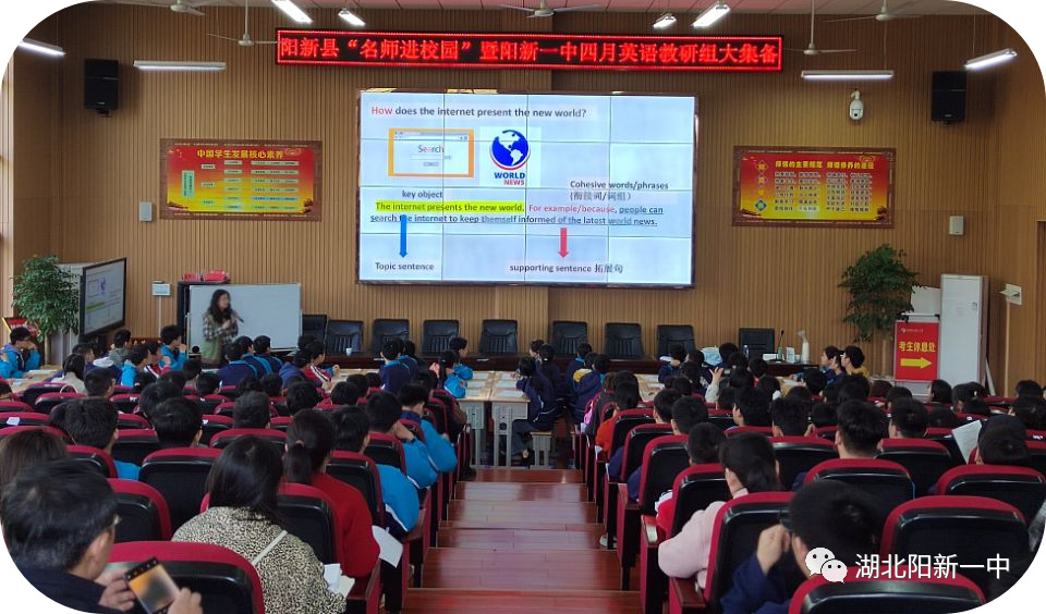 为加强对新课标、新教材、新高考背景下高考英语二轮复习方略的研究,阳新县教育局“名师进校园”暨阳新一中四月英语教研组大集备活动于2023年4月7日上午9:30-12:00在阳新一中明德楼报告厅举行。此次活动邀请了湖北省华师一附中青年骨干教师张悦老师和英语中心备课组长张红霞老师,她们分别带来了高考七选五的专题课和英语阅读与书面表达的专题讲座。 阳新县教科院英语教研员赵慧娟老师和尹国华老师、一中全体英语教师及县属兄弟高中高三英语教师等百余名教师参加了本次活动。本次活动由阳新一中英语教研组长余艳老师主持。