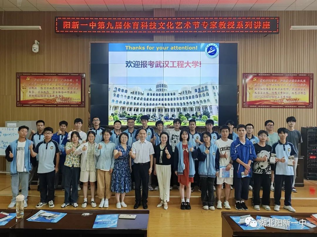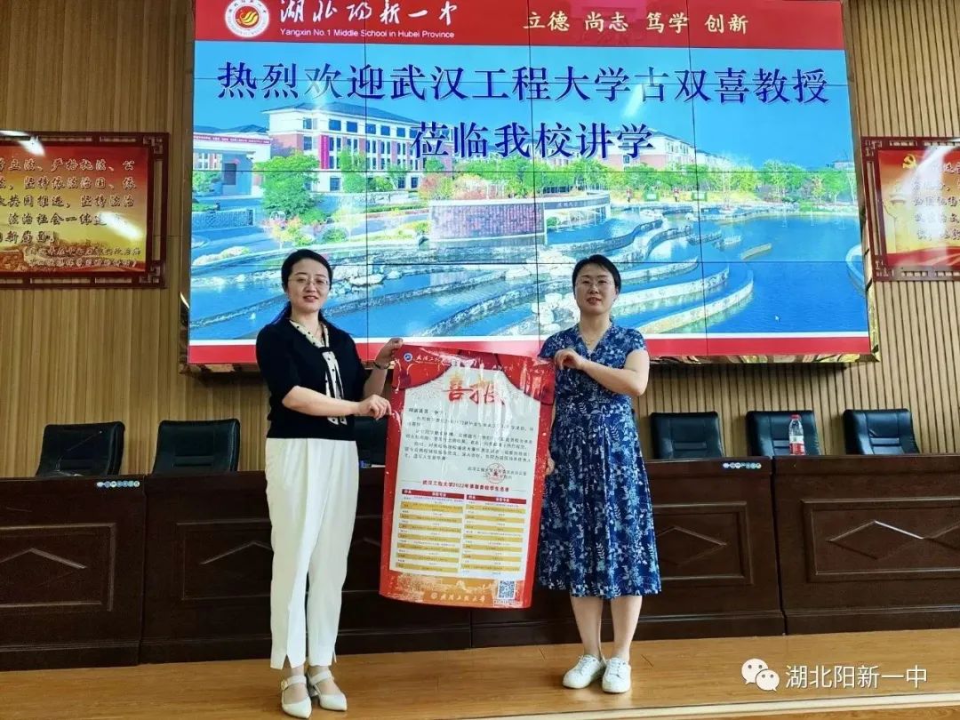 讲座结束后,化工与制药学院党委副书记周丹女士送上了武汉工程学院2022级阳新一中学子的喜报,并特别介绍了武汉工程学院,鼓励大家积极报考。短短一个半小时的讲座,学生们静心聆听、认真思考、积极回答,签名、合影、交流,现场氛围浓郁热烈。
