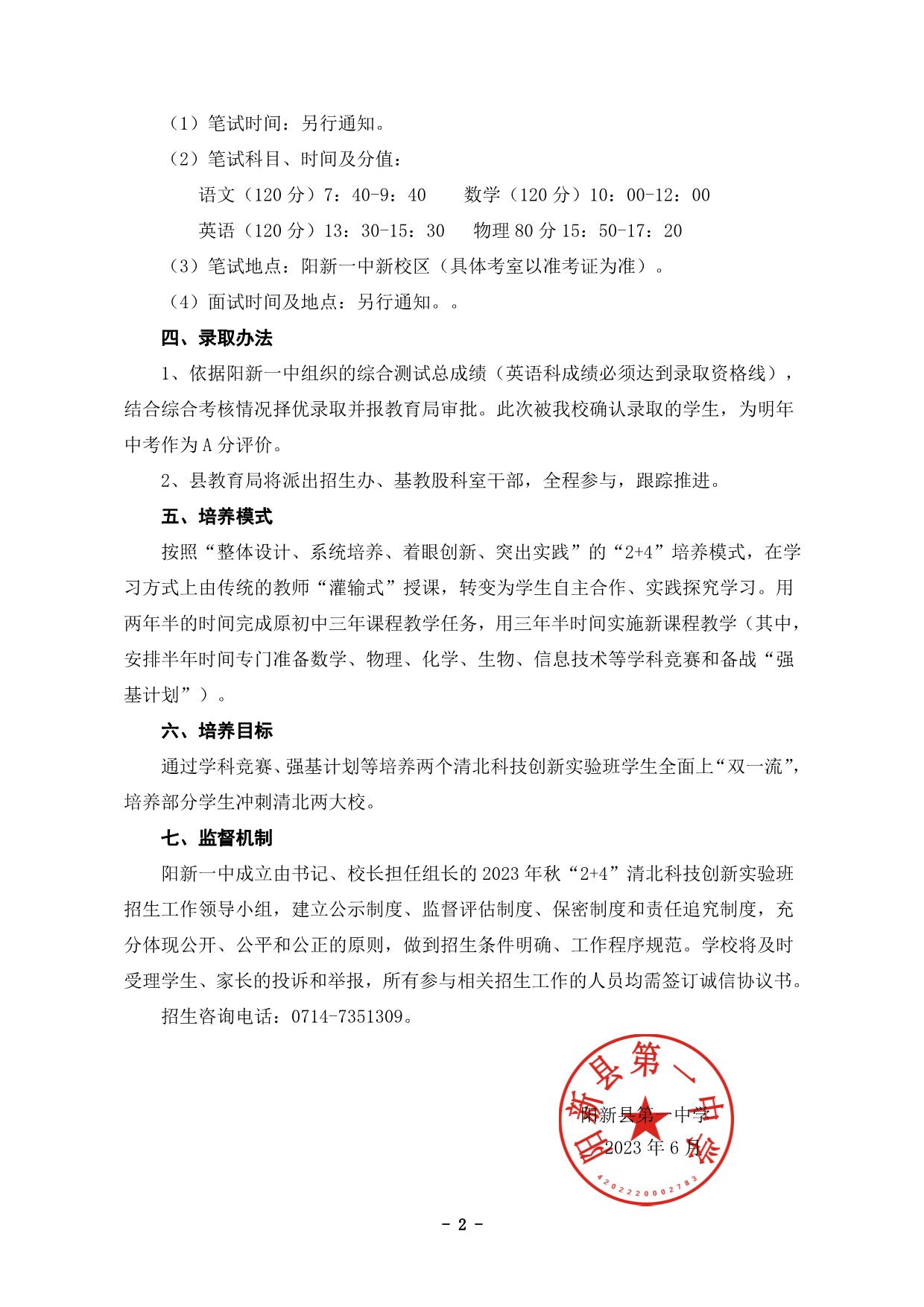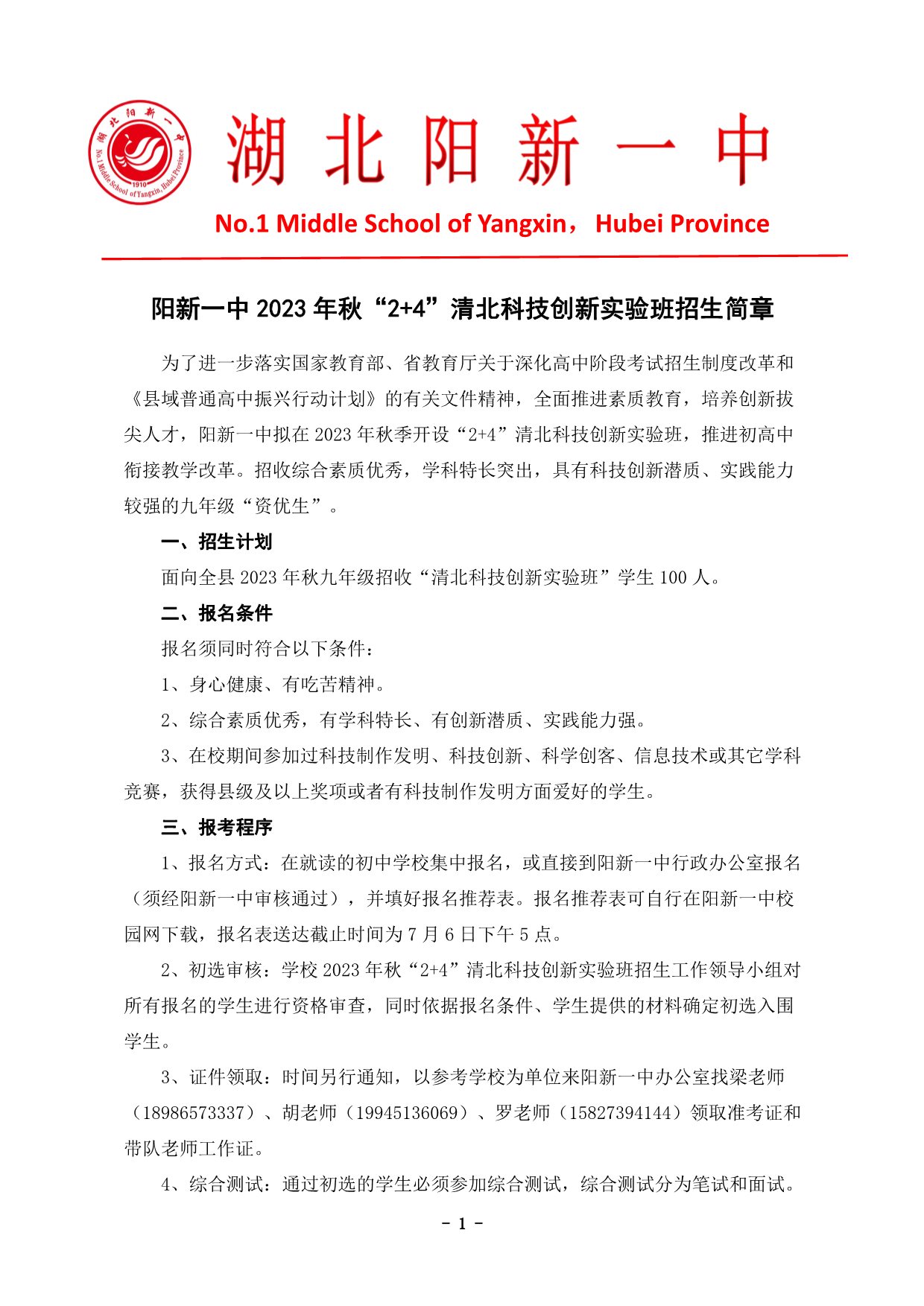 阳新一中2023年秋“2+4”清北科技创新实验班招生简章