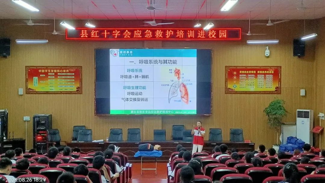 县红十字会讲解员介绍了红十字会来源及急救目的,以提高学生应急救护意识;紧接着从生命急救的黄金四分钟出发,以心肺复苏、海氏急救法,创伤包扎、溺水的预防与急救为重心,一个小时讲座,让同学们全面了解应急救护知识,现场气氛热烈。