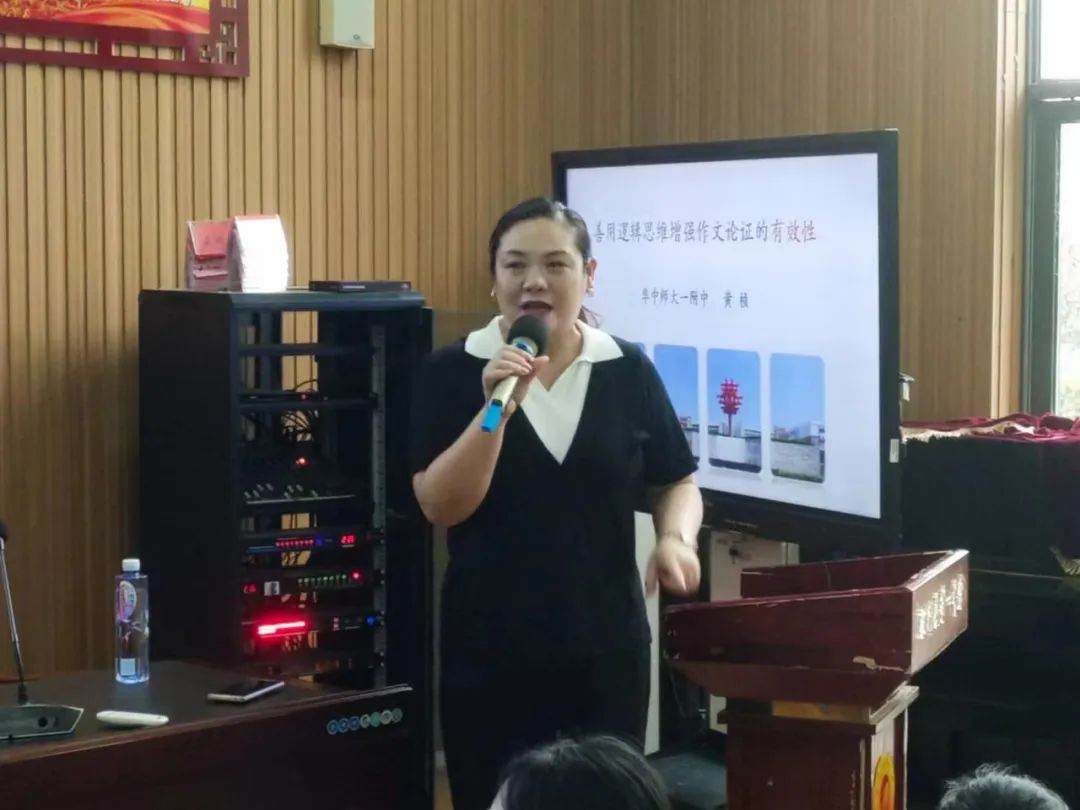 在示范课环节,黄桢老师主讲题为《善用逻辑思维增强作文论证的有效性》的写作复习示范课。黄老师从校园日常生活现象入手,以问题为导向,引导学生理解透过现象看本质,从而找到问题的根源,进而认识到思维逻辑链条能够挖掘事物的根本原因,推断事物的深远发展结果的重要价值。黄老师还结合2023年高考新课标I卷和武汉市9月高三调考作文试题的分析解读,让学生明白如何善用逻辑思维增强作文论证的有效性。黄老师循循善诱、深入浅出、妙趣横生、挥洒自如的作文课,让在场的学生笑声不断,收获满满,也让与会老师大开眼界,惊喜连连。