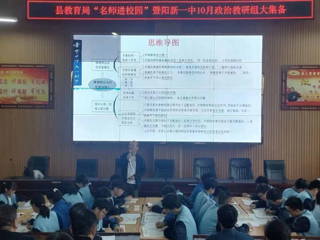10月27日上午,阳新县2024届“名师助推工程”暨阳新一中10月政治组大集备在我校明道楼学术报告厅举行。本次活动特邀华中师大一附中政治教研组长项俊老师作复习指导。县教科院副院长郑宏图到组指导。我校全体政治老师和县内各高中学校的部分高三政治老师参加活动。活动由我校政治教研组长定绍朋老师主持。