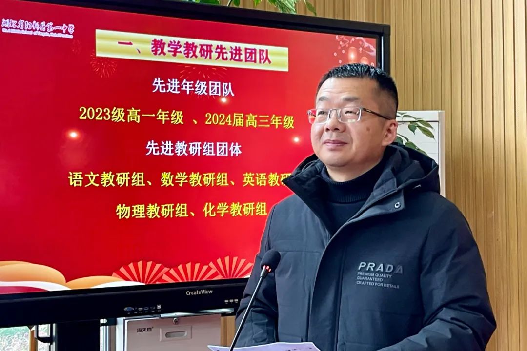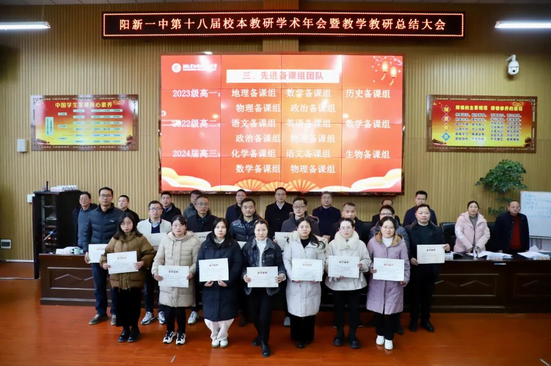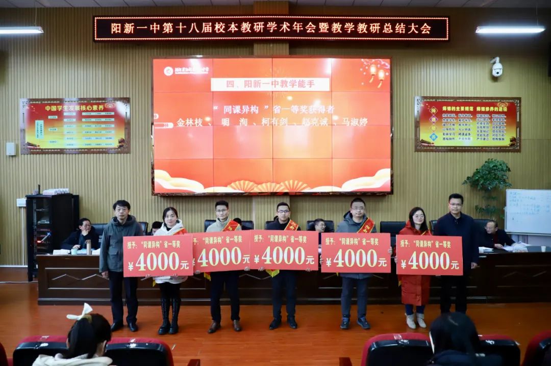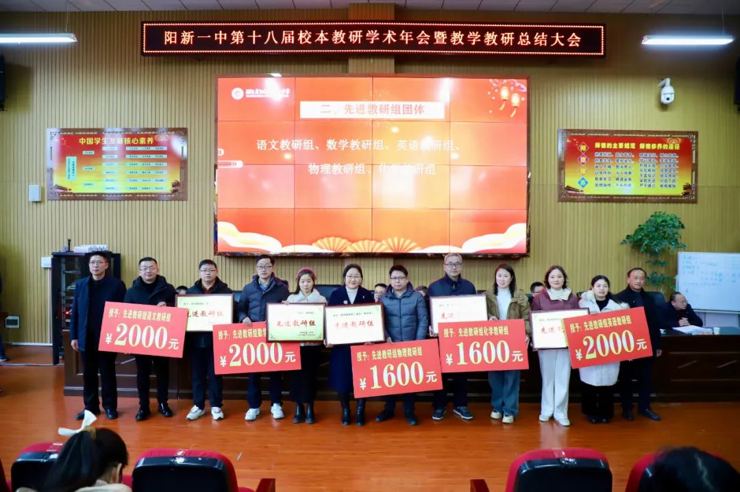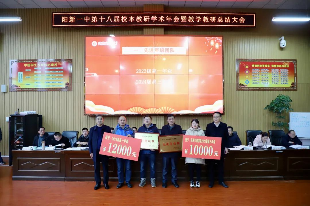 在颁奖环节,阳新一中教科室主任刘杰宣读先进表扬名单,县教育局长李细禄、县教科院院长柯于涛、阳新一中党委书记明道树、校长方长风、学校党(校)委成员为获得表扬的先进团队及先进个人颁奖。