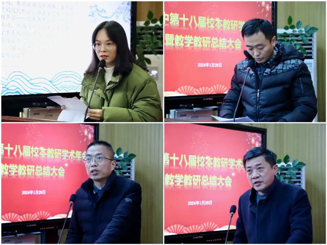 在分享环节,学术年会教学论文第一名获得者乐川椽老师,先进备课组代表高一地理组组长王民老师、高二语文组组长刘会火老师,高三年级主任向瑞生老师,作为先进代表作分享交流发言。
