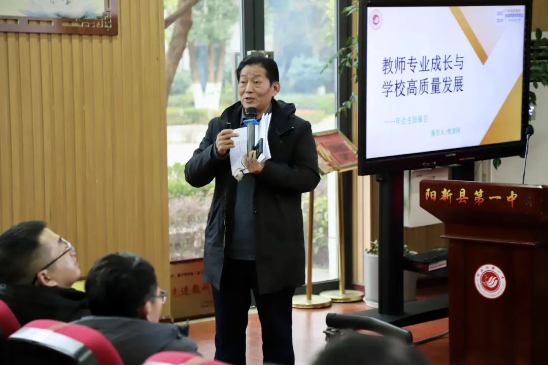 在报告环节,阳新一中教师教育学院执行院长焦龙河作《教师专业成长与学校高质量发展》主题报告。报告主要从五个方面展开:1.教师专业成长的重要性;2.教师专业成长的有效途径(个人层面);3.如何大力推进教师专业成长(平台层面);4.教师专业成长在学校高质量发展中的实践与探索;5.展望未来,共同推进教师专业成长与学校高质量发展。
