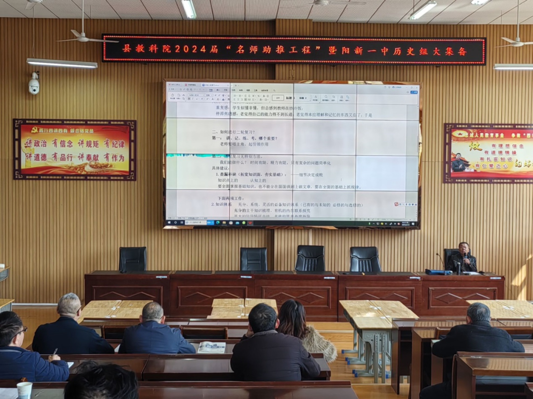 2024年3月12日上午,为进一步把准脉、定准向,提升高考二轮复习效果,有效指导学生的复习备考,全面提升教学质量,由县教科院组织,阳新一中承办的“名师进校园”活动在学校明道楼学术报告厅举行。本次活动的主讲人是武汉市学科带头人徐国富老师,县教研员及阳新一中全体历史教师、县内兄弟高中历史教师参加活动,活动由阳新一中历史组教研组长石教德老师主持。