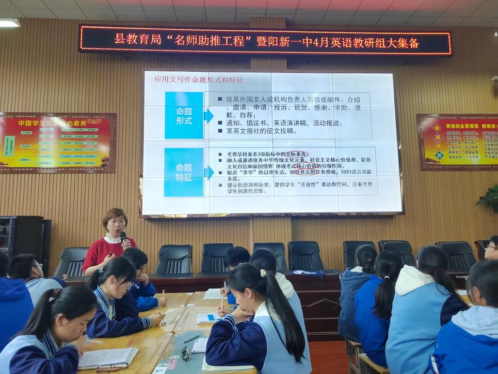 为了深入推进我校教学改革,助力2024届高三复习备考,2024年4月12日上午9时,阳新县"名师助推工程"暨阳新一中4月英语教研组大集备活动在阳新一中明德楼学术报告厅举行。此次活动特邀湖北省武昌实验中学陈克宏老师作二轮复习指导,阳新县高中英语教研员赵慧娟老师、一中全体英语教师及县属兄弟高中高三英语教师参加了本次活动。活动由阳新一中英语教研组长余艳老师主持。