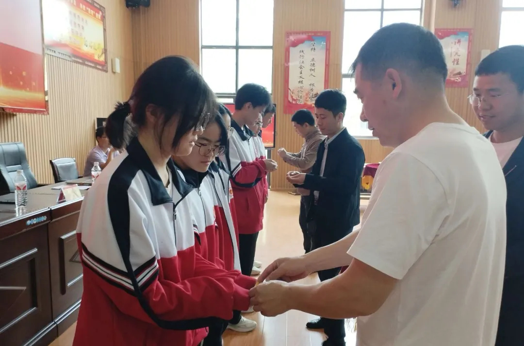 团县委副书记赵文山与湖北省劲牌公益慈善基金会黄石市区域代表冯志刚共同为项目揭牌,并为阳新一中受助学生代表赠予“劲牌阳光学子”胸牌。