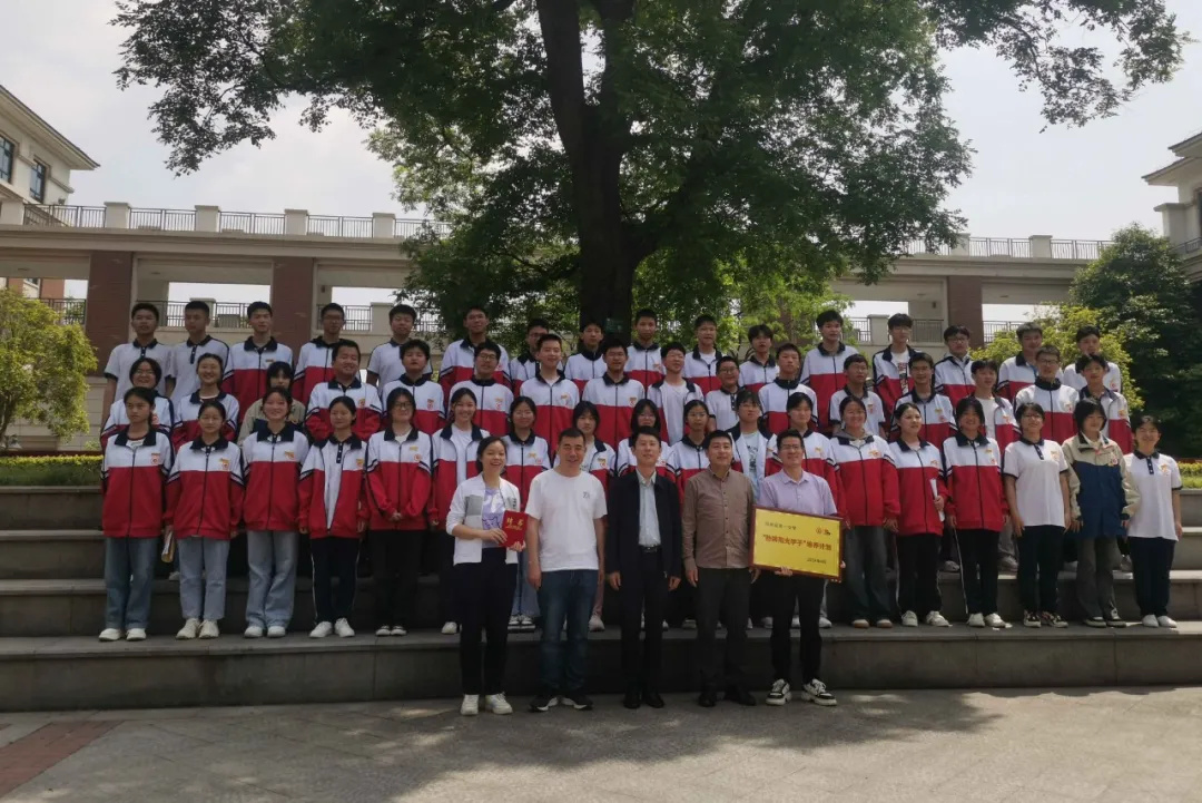 与会领导和50名受资助学生,在阳新一中明礼楼百年老树的见证下合影留念。