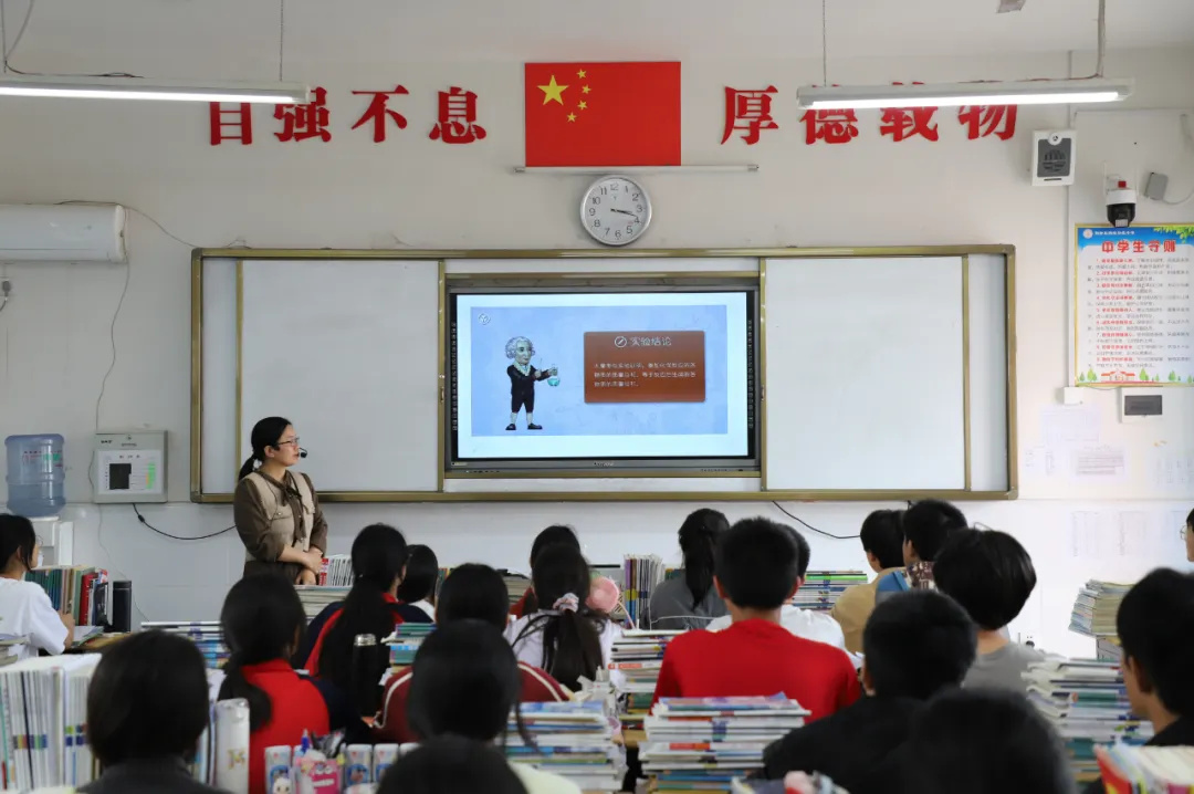 阳新一中朱建华名师工作室骨干教师袁恒在八(1)班主讲示范课《阿基米德原理》。他自制实验器材,课堂演示实验和学生实验设计新颖,现象明显;运用现代化的教学手段提前剪辑了微课视频,设计导学案,他将理论计算和动手实践巧妙结合,采用启发式教学模式,注重学生质疑和创新能力的培养,提高了学生的科学素养,极大地调动了学生学习物理的积极性。袁恒老师讲解清晰,板书规范,课件制作精良,发挥了示范引领作用,受到陶港中学王芳军校长,贾校长、袁老师等7位领导和老师以及阳新一中刘合凤、朱建华、詹康宁、翁茂文等领导和老师的一致好评。