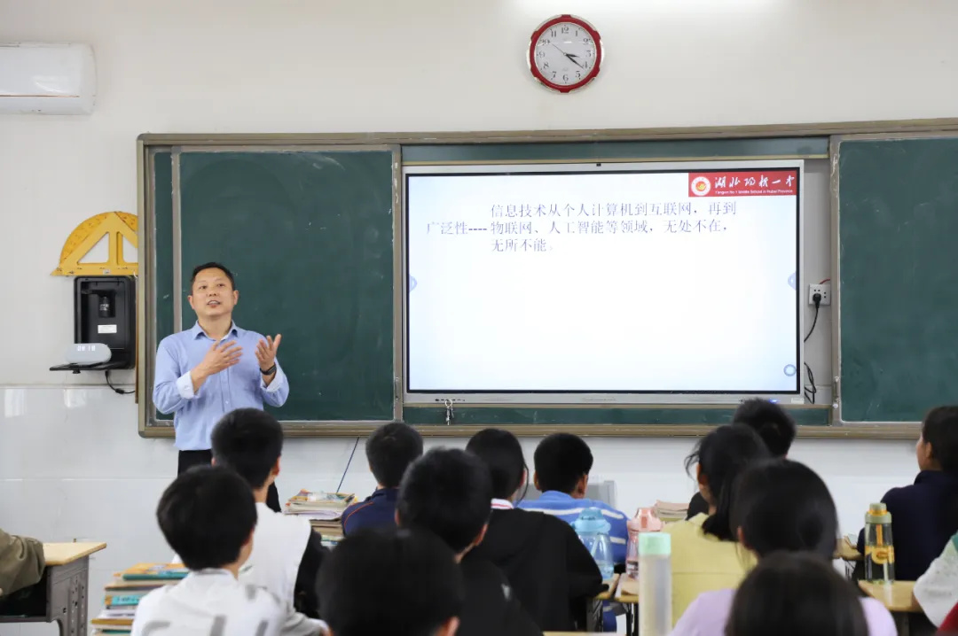 黄石市柯贤根名师工作室骨干教师汪洋在七(1)班讲授《奇妙的信息技术》。汪老师的课程以一段视频导入,这段视频以孩子们的家乡陶港作为背景,介绍了陶港地理人文等方面的信息,瞬间吸引了孩子们的注意力。汪老师趁机引出了信息的概念,层层递进,与同学们交流了什么是信息技术以及信息技术的特点。汪老师用生动的图片和视频介绍了常见的信息技术设备及其应用,启迪学生思考在信息技术迅猛发展的浪潮中应怎样锤炼自己的本领,更好为国家和社会做贡献。最后,汪老师以一首诗歌结束,同学们意犹未尽。本课堂气氛活跃,师生互动积极,每位同学都沉浸在课堂中。这堂课不仅是一次知识的传递,激发了孩子们对知识的渴望,还是一次心灵的触碰,点亮了孩子们眼中求知的光,为他们播下了一颗希望的种子,对未来的憧憬。