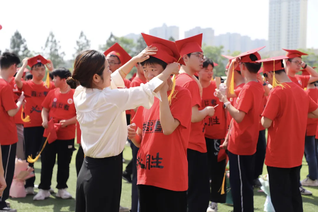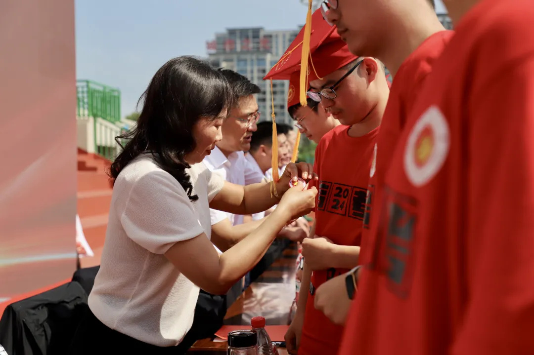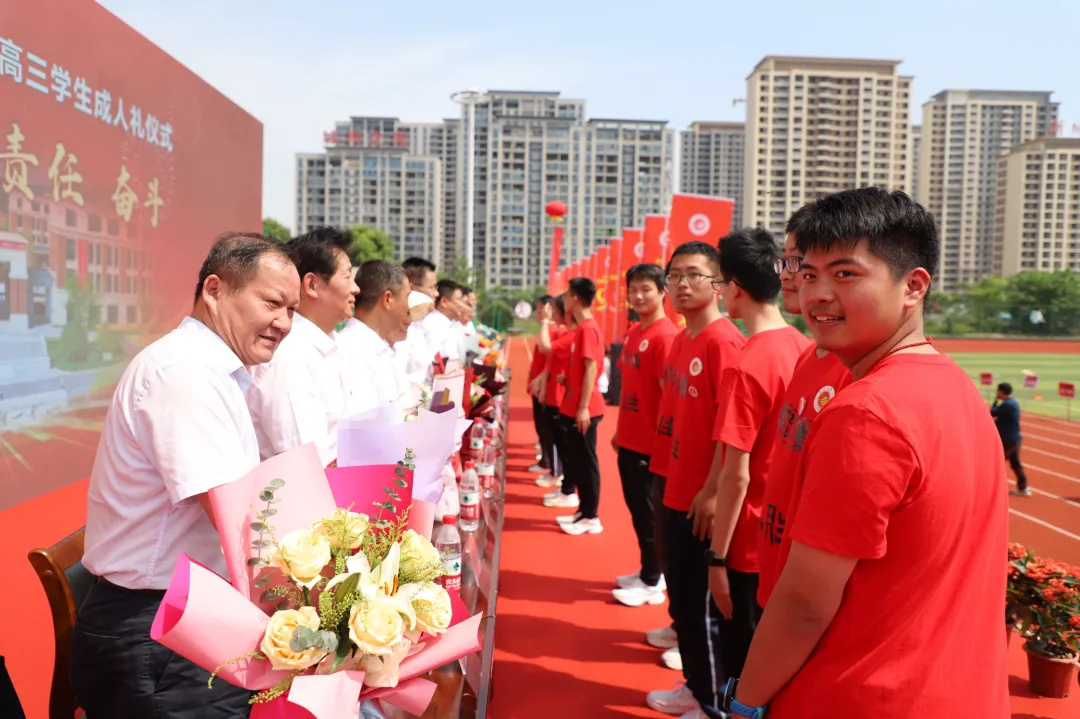 十八而志,责有攸归;十八而志,大任始承。冠礼仪式上,学生代表为主席台领导和嘉宾献花。人大常委会副主任吴素贞、校党委书记明道树等领导为学生代表佩戴纪念章,家长们为孩子佩戴成人礼帽,成人徽章,赠送《中华人民共和国宪法》手册,场面庄重而又温馨。胸佩灵动的成人徽章,头戴火红的成人礼帽,宣告新篇章的开启,寓意新高考的胜利。