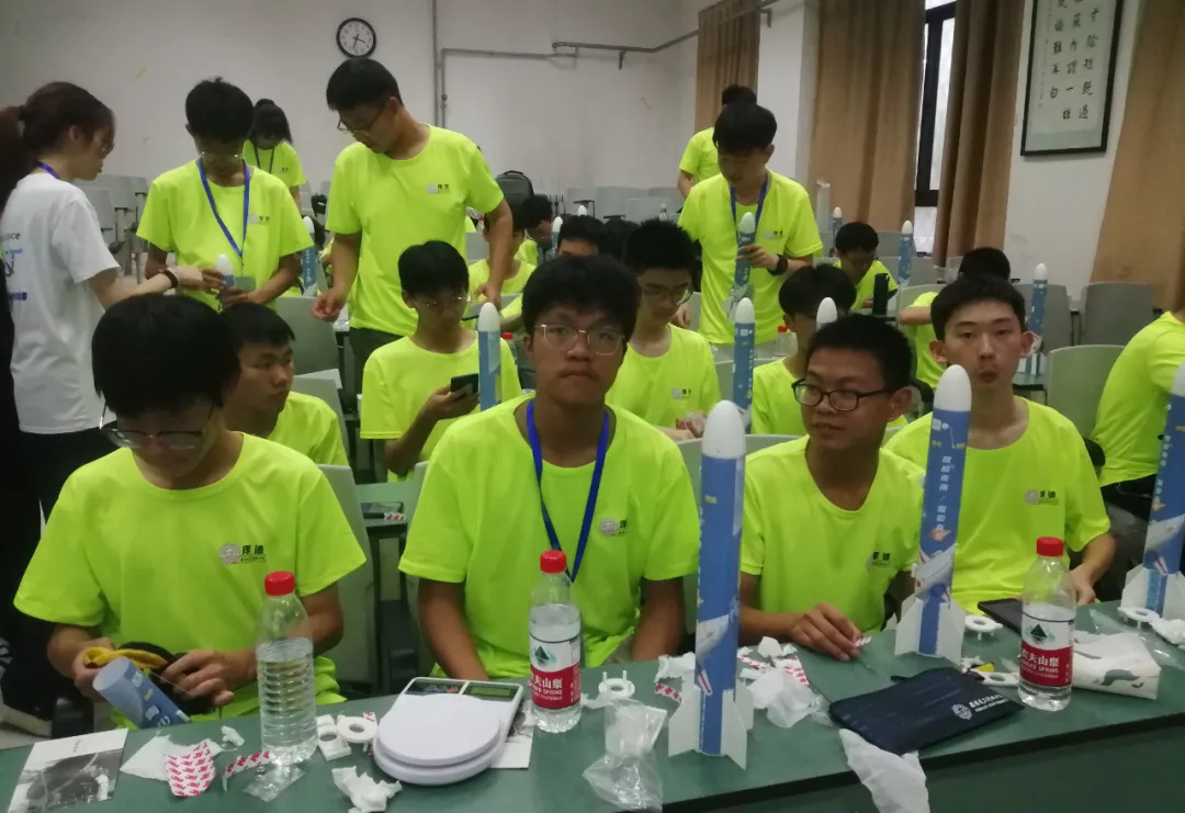 7月17日,全体营员师生参加火箭制作与发射相关科普知识培训学习和比赛,该火箭由固体火药燃料发动机推动,包括箭体、整流罩、降落伞、尾翼、发动机在内的所有零部件均由学生现场拼接组装。要求发射后竖直升空,将一鸟蛋送入30米高度,在空中自动弹开降落伞,鸟蛋落地不能破碎,技术难度较大。在阳新一中党委书记方长风同志“全面发展、多元发展”育人理念的指引下,阳新一中10名营员在参加科学营活动之前已多次参加学校开展的各级各类科普实践活动。他们理论水平高,动手能力强,阳新一中10名营员全部圆满完成火箭制作及发射任务,成绩优异。