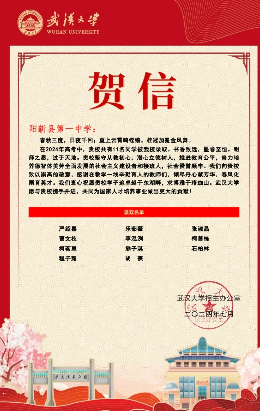 近日,我校收到武汉大学发来的喜报。祝贺我校严绍嘉等11名学子被录取。