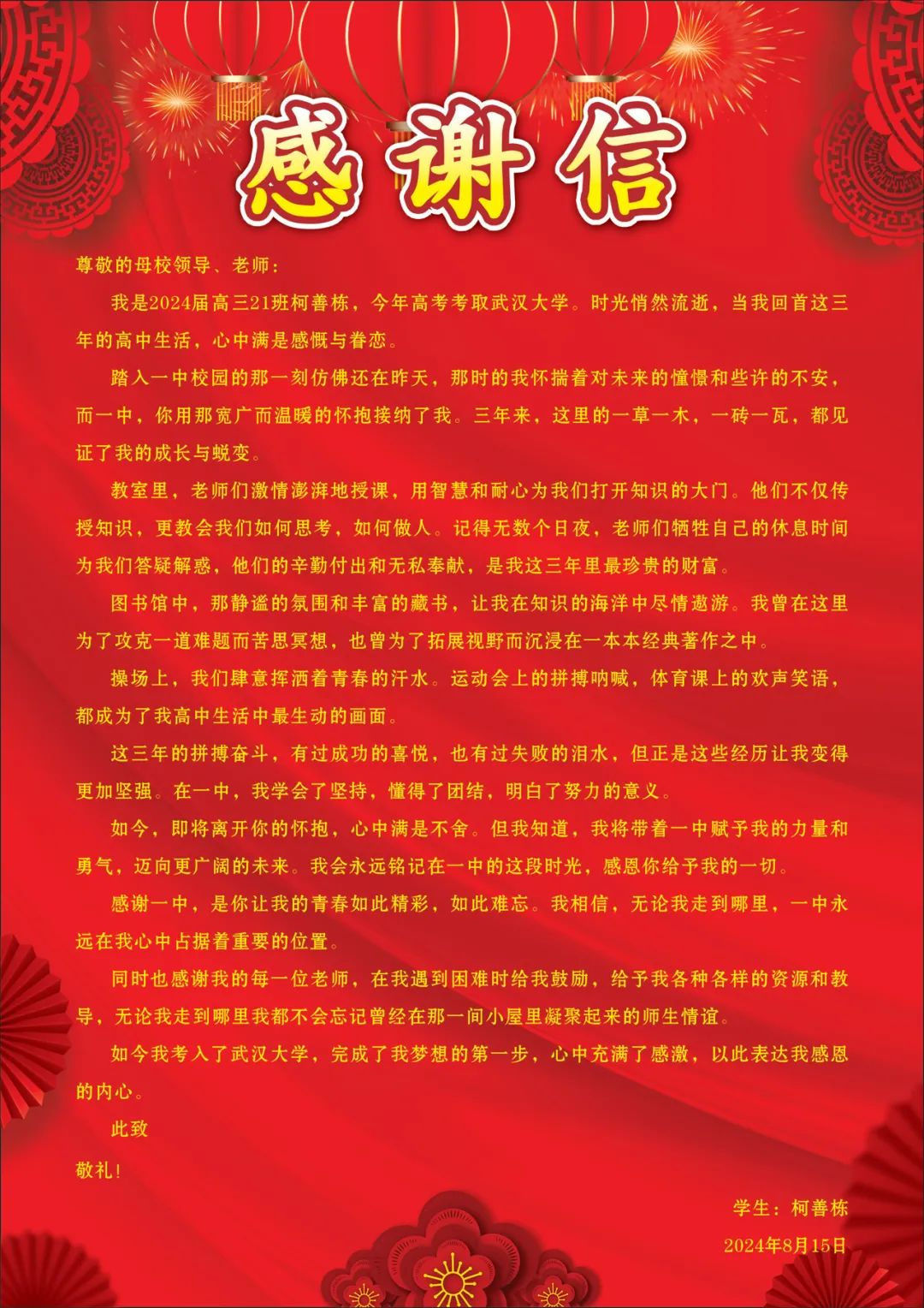 阳新一中2024届优秀毕业生柯善栋发来感谢信