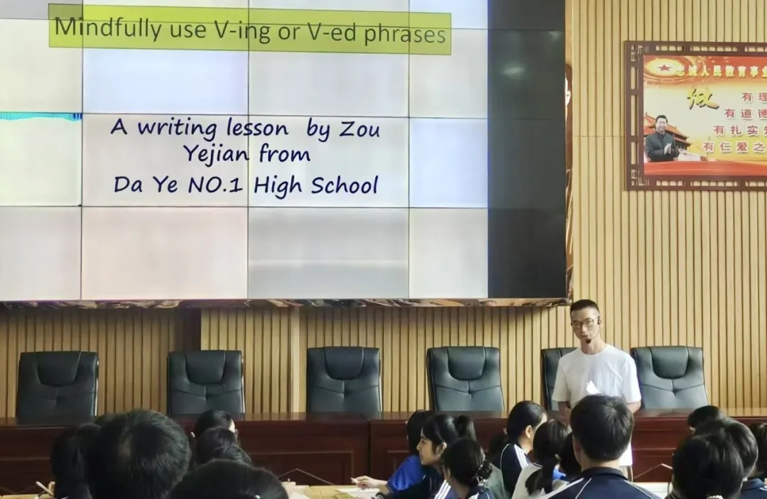 第二节课由来自大冶一中的邹冶建老师主讲《用非谓语动词提升写作》,邹老师结合起点考试的读后续写文章,环环相扣,鼓励学生大胆写作,发展创造性思维,培养学生的思维能力和创新性精神。