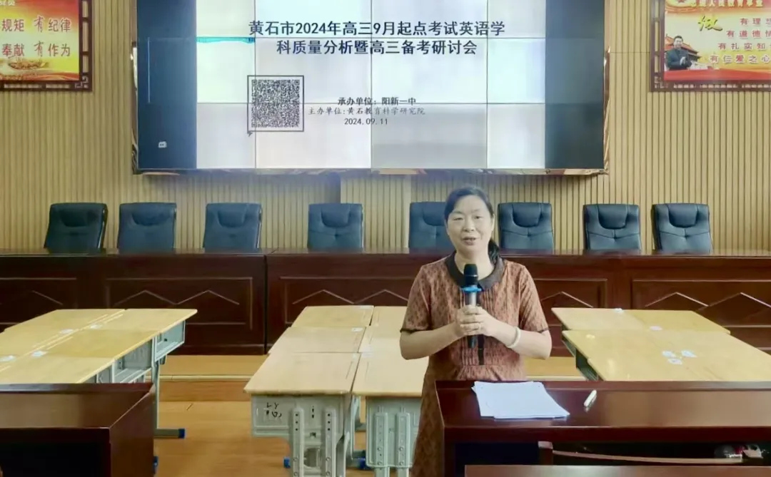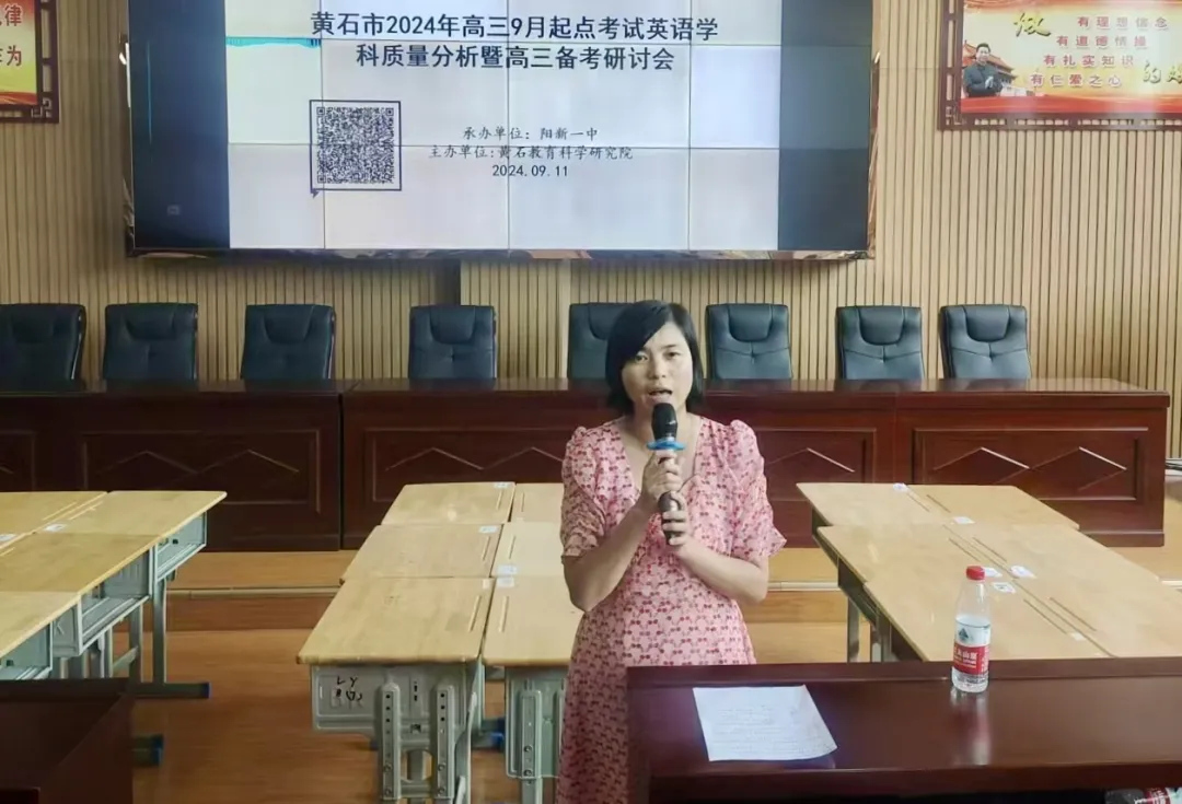 9月11日上午,黄石市2024年高三九月起点考试英语学科质量分析暨高三备考研讨会在阳新一中隆重举行。本次活动旨在促进高三一轮专题复习,有效地指导高三一轮复习备考。黄石市教研员汤利平老师,阳新县教研员赵慧娟老师,阳新一中副校长徐美姝及黄石、大冶和阳新各高中学校近120名英语教师参加此次活动。活动由阳新一中英语教研组长余艳主持。