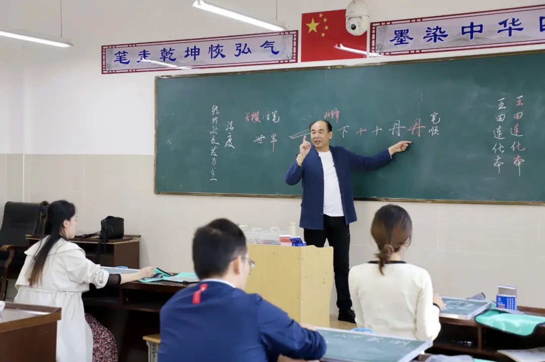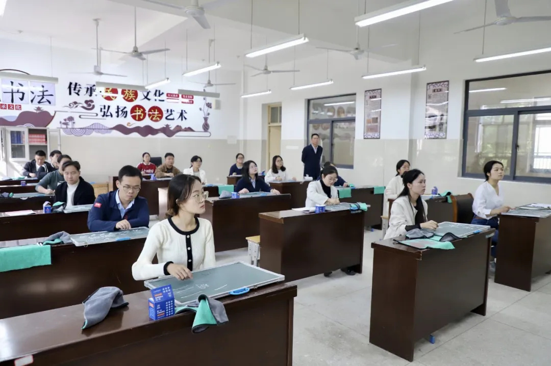 “纸上得来终觉浅,绝知此事要躬行。”在余老师的精彩讲解后,教师们纷纷拿起粉笔开始练习。余老师穿梭于学员之间,对他们的作品进行了耐心而细致的指导。在余老师的悉心点拨下,青年教师们不仅将理论知识内化于心,更通过实操练习将书法之美外化于形,深刻领略到了粉笔字的独特魅力与书写的无穷奥秘。