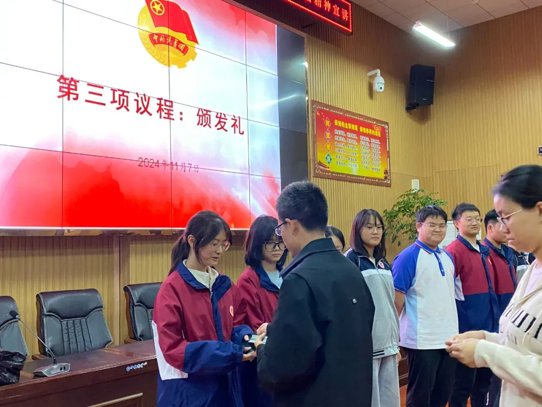 校团委书记陈湖庚为新团员颁发团员证,佩戴团员徽章,勉励新团员继续奋发向上,争做有理想、有担当的优秀共青团员。