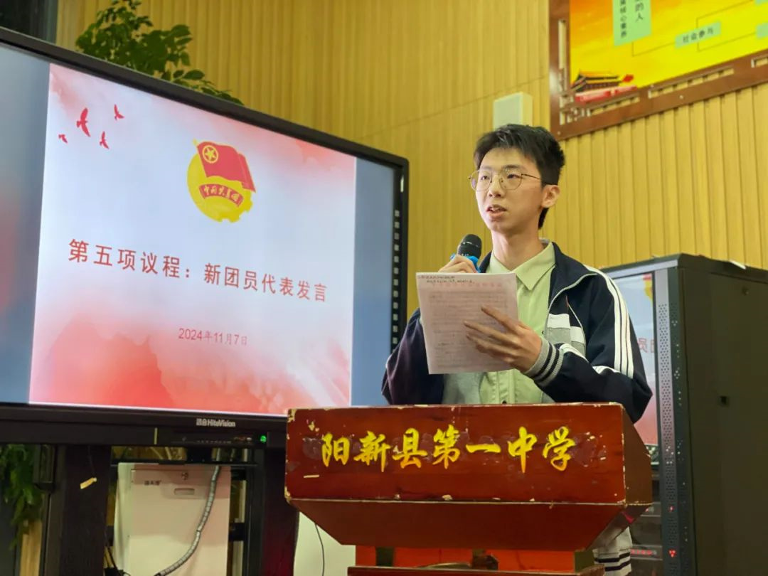 来自高三(7)班的陈恩琪同学,作为老团员代表,带领新团员宣誓。在庄严的团旗下,新团员们举起右手,庄严宣誓:“我志愿加入中国共产主义青年团,坚决拥护中国共产党的领导,遵守团的章程,执行团的决议,履行团员义务,严守团的纪律,勤奋学习,积极工作,吃苦在前,享受在后,为共产主义事业而奋斗!”铿锵有力的誓言回荡在会场,展现了新团员们的坚定信念。
