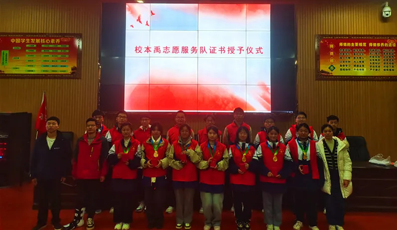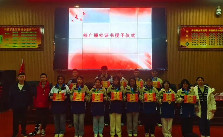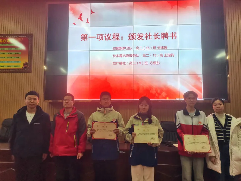 我校第十一届体育科技文化艺术节取得圆满成功,可谓亮点纷呈,其中学生社团别具特色。为更好贯彻我校“全面育人,多元育人,特长育人,特色育人”的育人理念,校团委对学生社团进行总结评比。特别是校国旗护卫队、本禹志愿服务队、校广播社,这三个社团初具规模,运行成熟,成为校园一道亮丽风景。校团委表扬了一批优秀社员、优秀社干,并对这三个社团的社长颁发了聘书。
