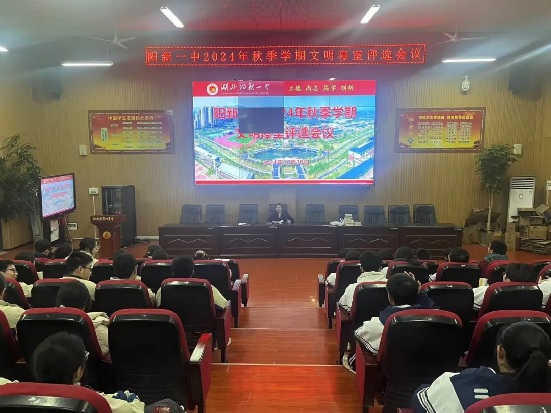 为了深入实践我校“全面育人、多元育人、特长育人、特色育人”的育人理念,进一步促进学生综合素质的提升与个性化发展,阳新一中于12月20日18时40分,在明德楼报告厅隆重举行了阳新一中2024年秋季学期学生会总结评比大会暨文明寝室评选活动。参与活动的有德育室主任肖鹏,宿管部工作人员,高一、高二、高三年级各班班长、寝室长代表及学生会成员。活动由德育室胡家亮老师主持。