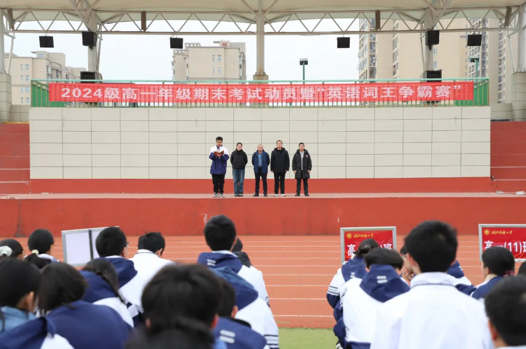 千人同场竞技,百舸破浪争先。1月8日上午,阳新一中2024级高一年级在学校田径运动场举办了期末考试动员大会暨“英语词王争霸赛”,活动旨在激励学生全力备战期末考试,同时强化英语单词识记,激发英语学习兴趣。本次活动由年级支部书记邓丽娟主持。
