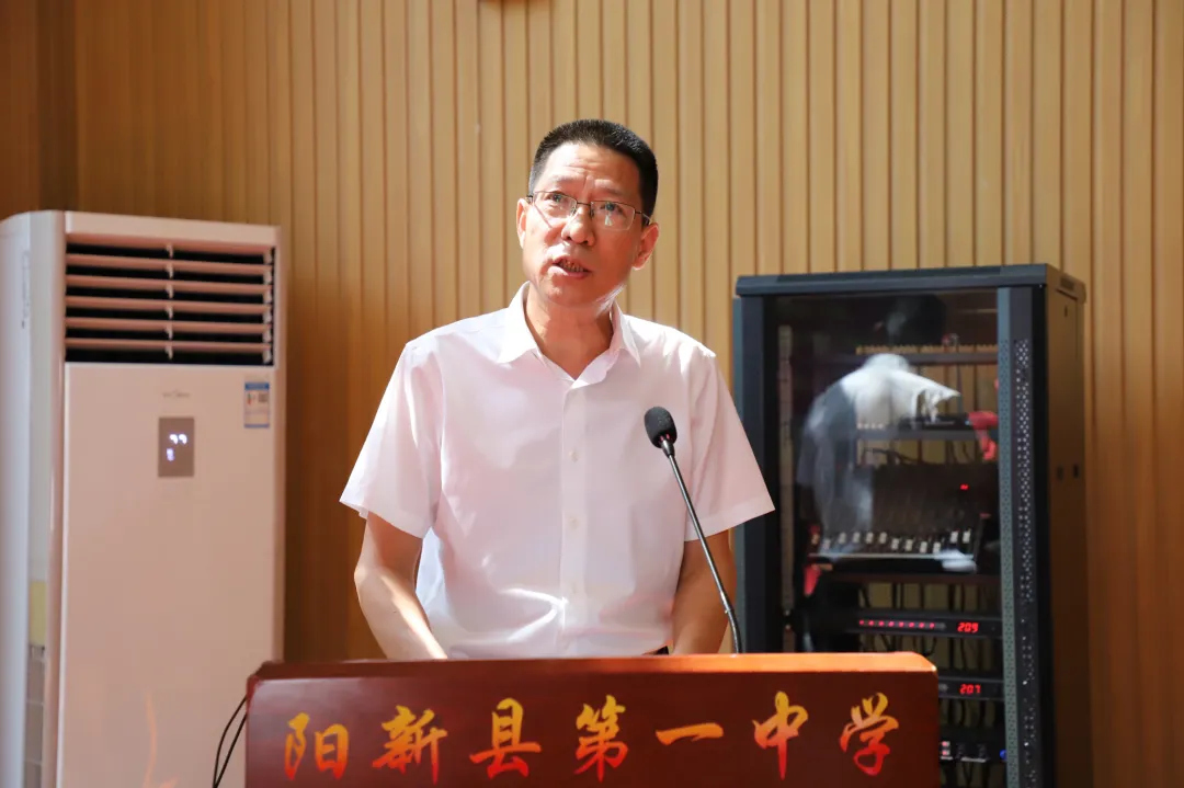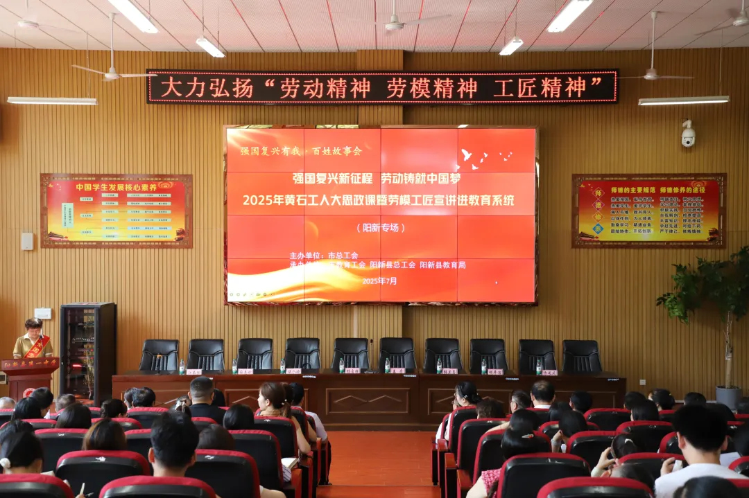 7月9日下午,由黄石市总工会主办的2025年黄石工人大思政课暨劳模工匠宣讲教育系统专场报告会在阳新一中隆重举行。市总工会党组成员、副主席杨自强,市教育工会主席姜赍,市教育局四级调研员毕全琦,市教育工会副主席麻志斌,市教科院院长张兰喜,阳新县总工会党组书记、常务副主席明平浩,阳新县教育局党组书记、局长江书强,阳新一中党委书记方长风,县教育局副局长、教育工会主席汪承权,教科院院长柯于涛及相关股室负责人出席会议,全市111名青年教师及阳新县部分中小学教师代表共200余人参加。会议由市教育工会主席姜赍主持。
