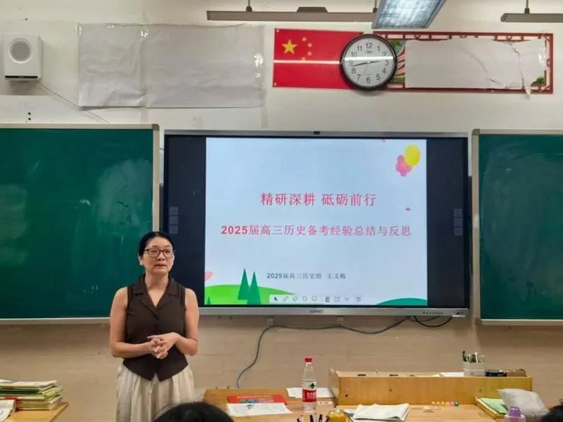 经验交流环节,首先2025届备课组长王义梅老师作经验分享。王老师是我校历史组的首席教师,有着丰富的高三复习备考经验。在研讨中,王老师毫无保留地将自己多年积累的经验倾囊相授。她详细地介绍了2025届高三在基础夯实、训练反馈、集备集研以及面批面辅等方面的经验。同时,也在研究深度、能力培养、分层教学等方面做了反思。