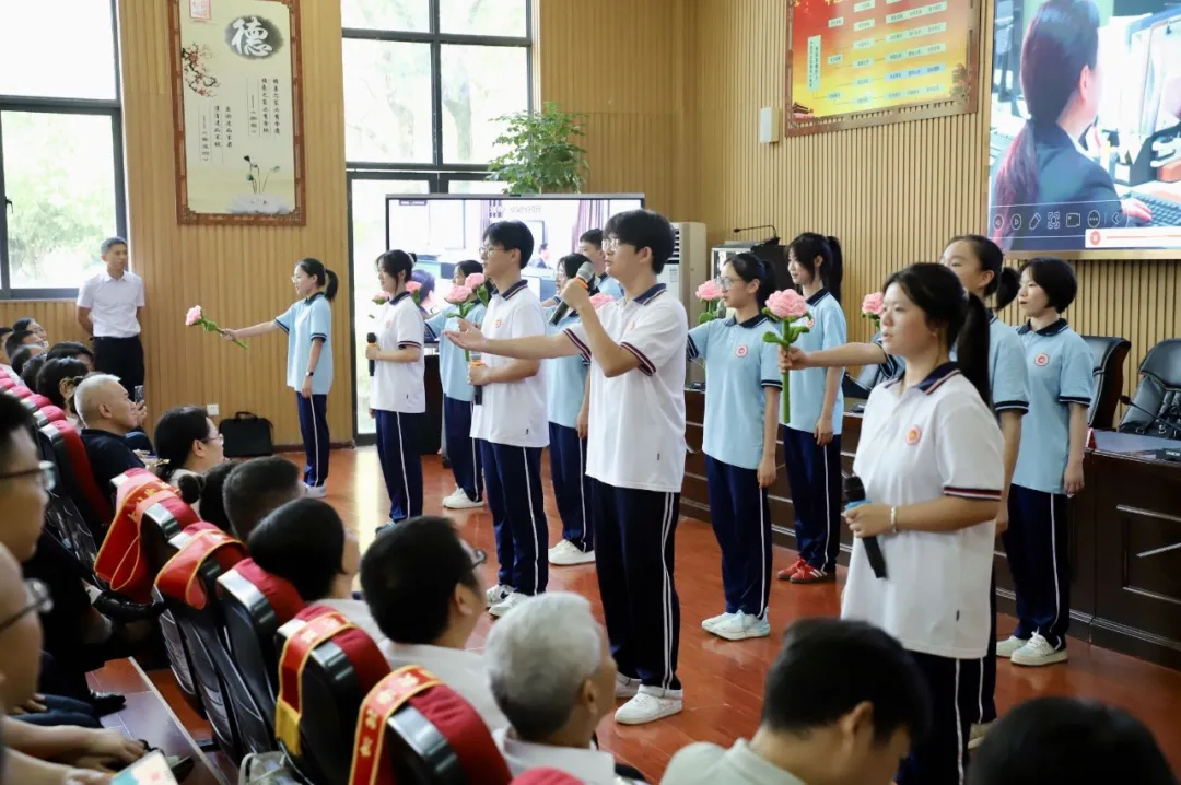 高一、高二学生为老师们献上精心准备的手语舞——《送你一朵小红花》,并进行了深情的朗诵。