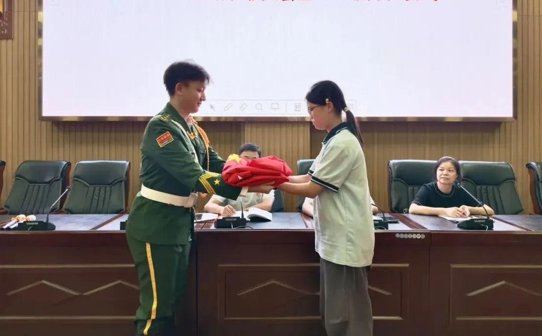 2024级国旗护卫队队长王斯弘、2025级国旗护卫队队长王沐作为新老队长分别发言并进行授旗仪式,两位同学在发言中表示:始终以“护好一面旗,做好一个人”为信念,接力国旗护卫队的责任与担当。
