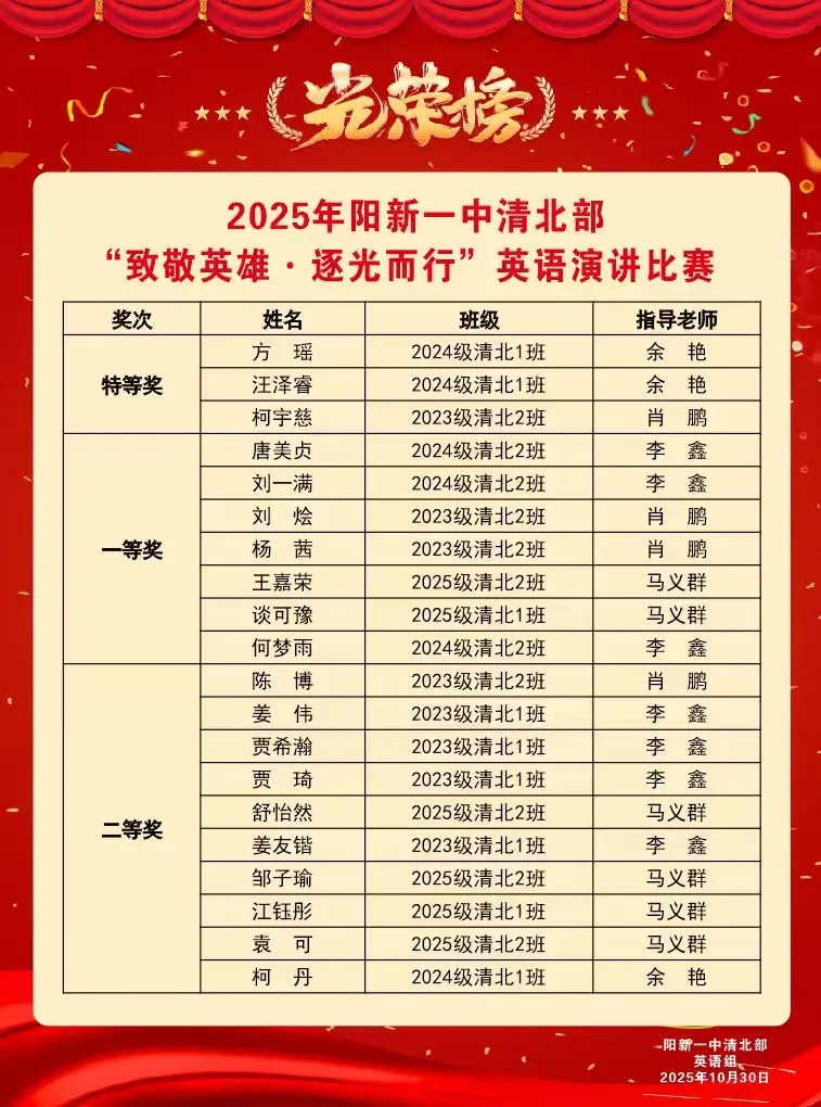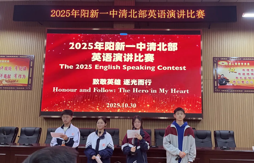 本次英语演讲比赛展现了一中学子的英语素养与精神风貌,深化了全体同学对英雄精神的认知与理解。选手们以语言传递信念,以表达诠释理想,在提升综合能力的同时,在心中植入了崇敬英雄、追寻光明的精神基因。期待全体同学以此为契机,以英雄楷模为引领,在未来的学习生涯与个人成长中砥砺前行、勇攀高峰。