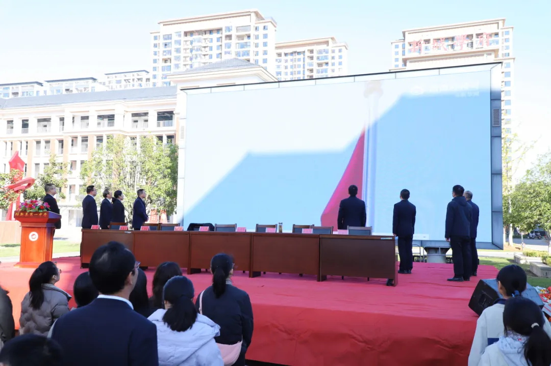 大会在庄严的升旗仪式中开始,全体师生神情专注,高唱国歌,行注目礼。