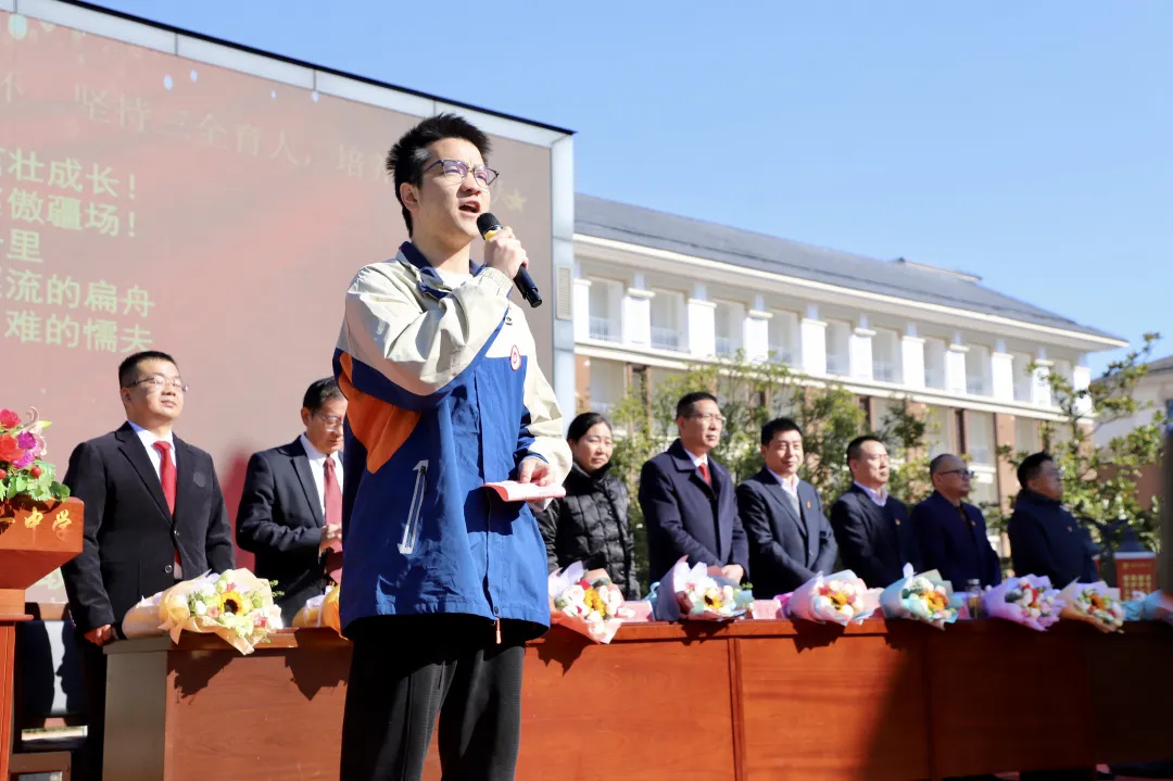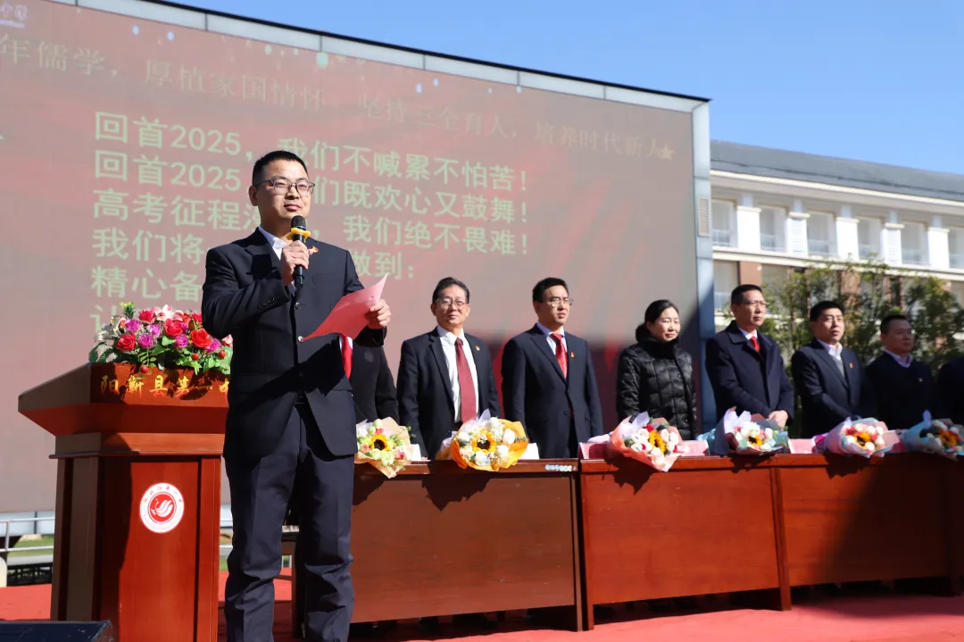 校党委书记方长风作《以青春赴山海,用奋斗赢未来》的讲话并提出四点殷切期望:一是以“坚定不移”的信念,筑牢思想之基,让目标成为前行的不竭动力;二是以“精益求精”的精神,夯实能力之石,于细微处打磨学科素养;三是以“同舟共济”的姿态,凝聚奋进之力,在互助中共同成长;四是以“张弛有度”的节奏,保持健康之躯,让良好状态贯穿备考全程。方书记高度肯定了高三师生取得的成绩,强调高三的征程从来不是坦途,同学们日复一日的坚持诠释了青春最美的模样,正是老师们的“春风化雨”,才有了学子们的“春华秋实”,希望老师们继续发挥“钉钉子”精神,精准研判考情,靶向突破难点,做学生最信赖的“引路人”和“守护者”,做好学生征途中坚强的后盾。方书记说道:在接下来的200天里,希望大家以笔为剑,以梦为马,不负青春,不负父母,不负恩师,更不负那个全力以赴的自己!