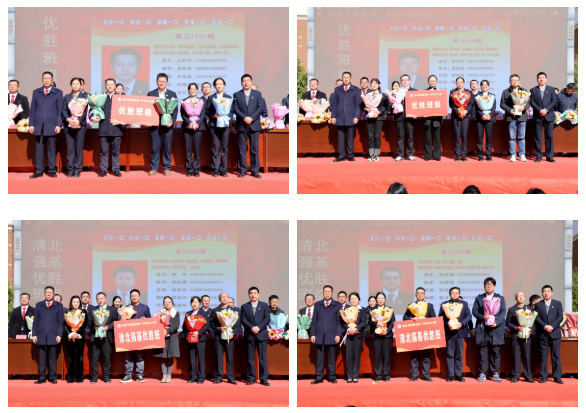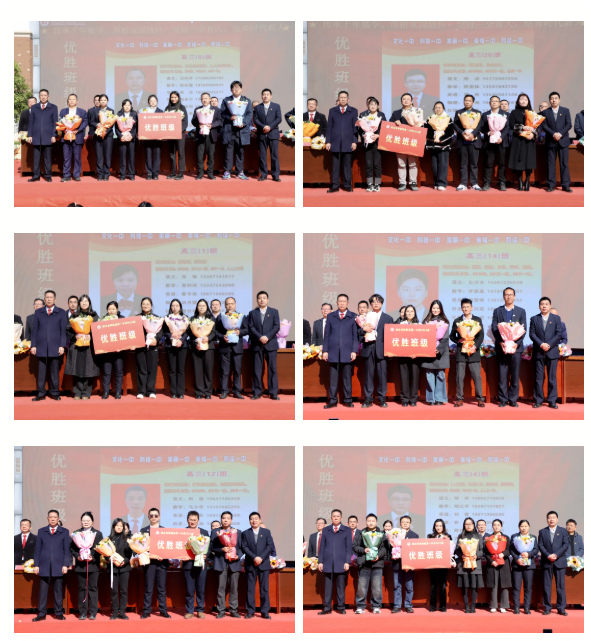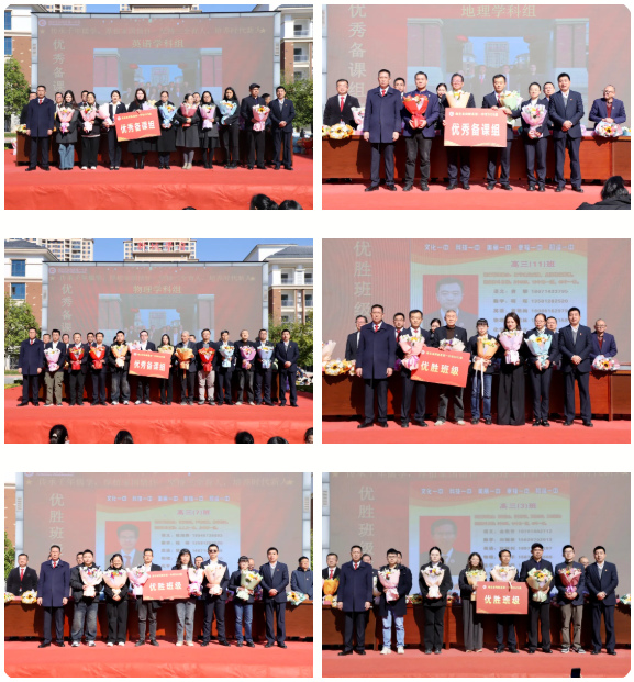 德育室副主任秦青山老师宣读各班期中评比表扬名单,陈松林主任宣读期中考试优胜学子、优秀备课组、优胜班级名单。与会领导为受表扬学子、备课组、班集体颁奖授花,灿烂的笑容与鲜艳的花朵相映成趣,成为广场上最动人的风景。