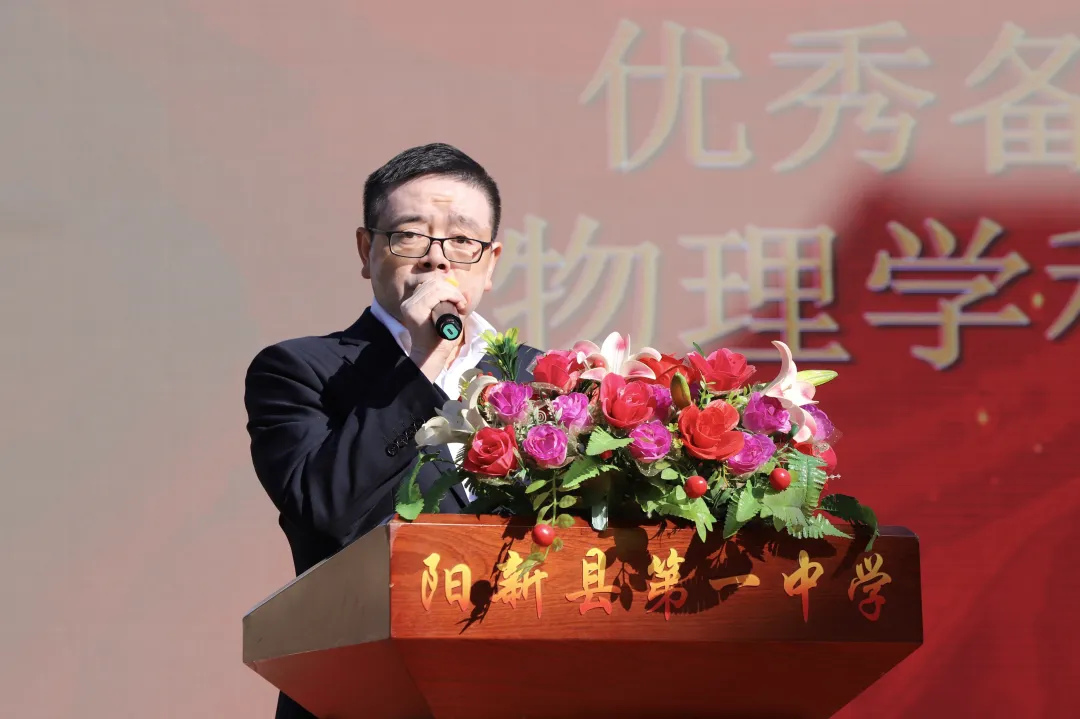 物理备课组组长黄平刚老师作物理学科学法指导,并寄语同学们以力与运动的执着,勇往直前,永不言败;以能量守恒的信念,坚信每一份努力,终将闪耀;以万有引力的向往,心向梦想,无所畏惧;以量子力学的无限,探索无限可能,创造奇迹。