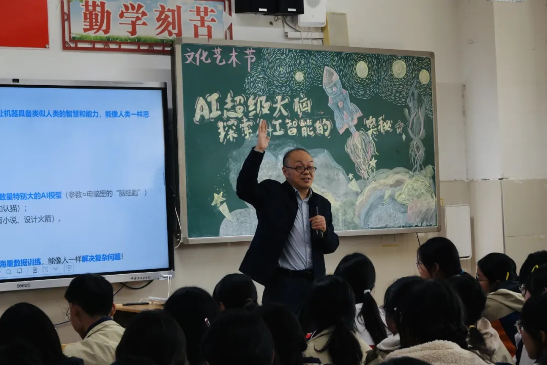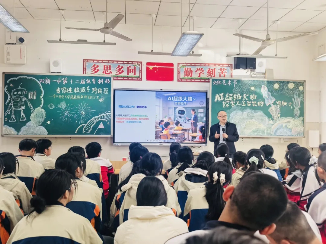 征途向新,探索不止。为激发学子创新热情,紧扣时代科技潮流,11月28日下午,华中师范大学廖盛斌教授应邀为高三学子开展以“AI超级大脑——探索人工智能的奥秘”为主题的科普讲座。教室内座无虚席,氛围热烈,阵阵掌声中,科技探索的种子悄然在学子心中扎根。
