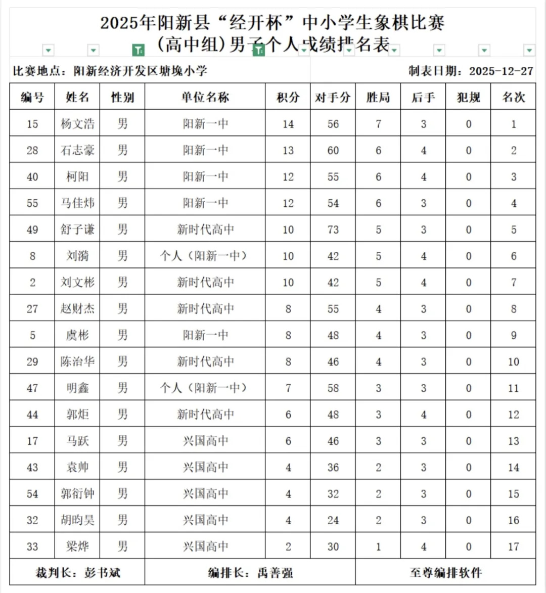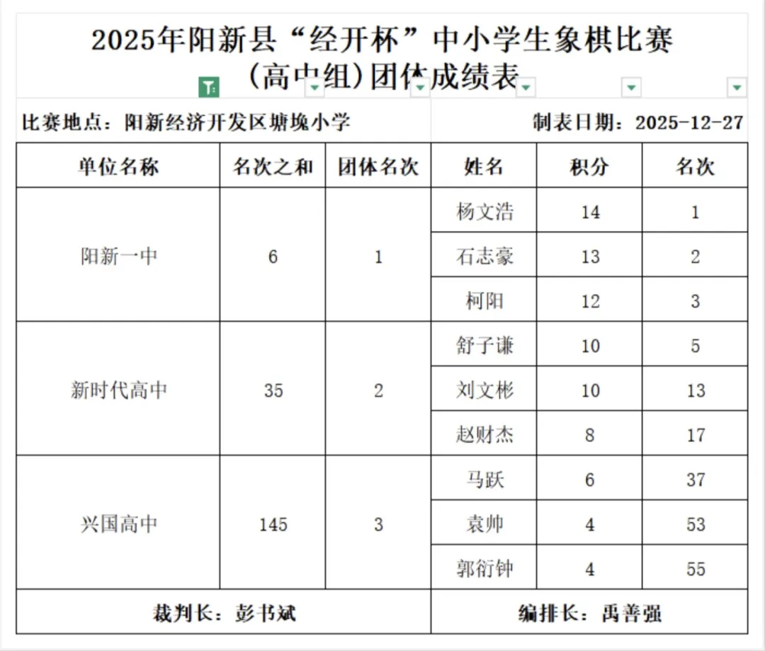 12月27日,阳新县“经开杯”中小学生象棋比赛在塘堍小学圆满落幕。本次赛事由县教育局主办,汇聚全县近五百名中小学象棋爱好者同台竞技。赛场上,阳新一中参赛选手沉着应战、奋勇拼搏,不仅连续两年蝉联高中组团体、个人双冠军,更强势包揽个人赛前四名,展现了过硬的棋艺素养与团队协作能力。