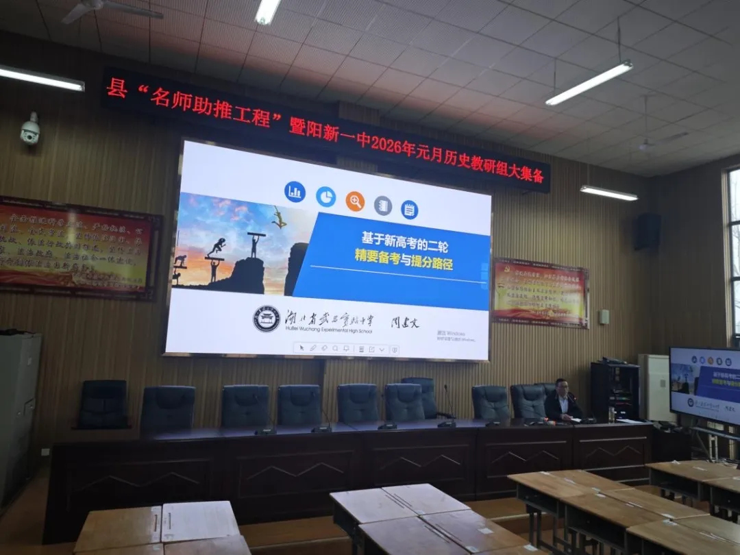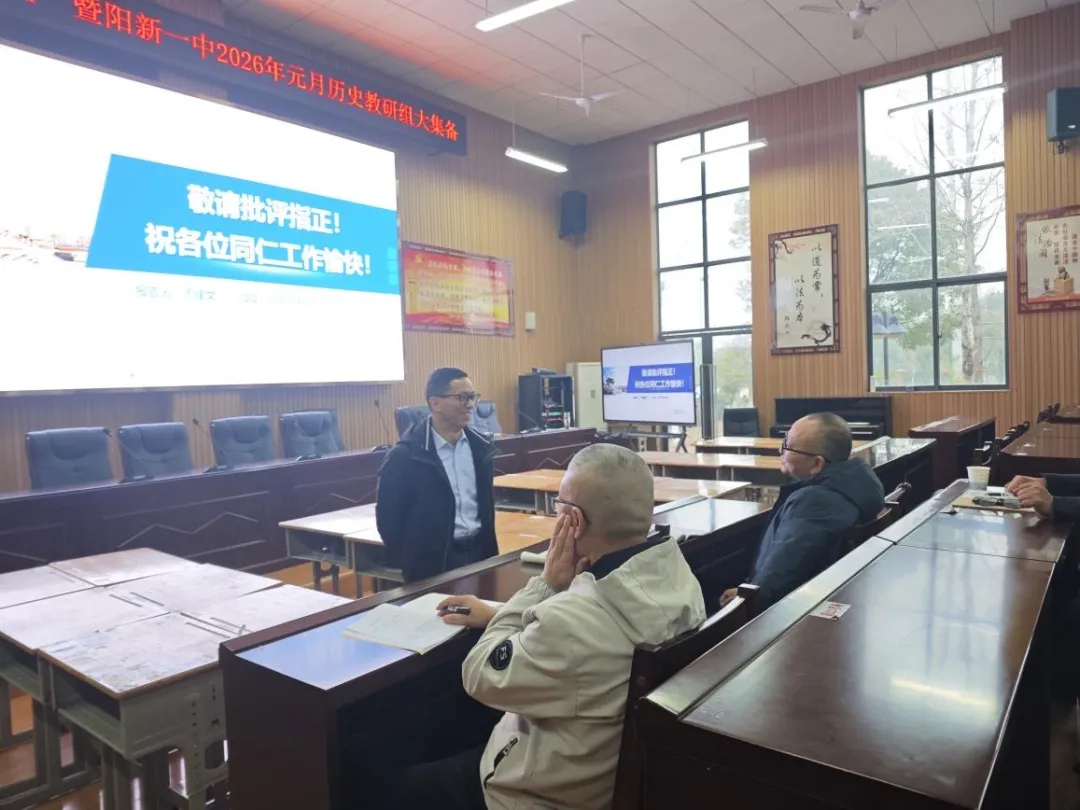 为精准把握新高考命题趋势,优化历史学科复习备考策略,1月16日下午,我校历史教研组在明礼楼开展元月大集备活动。本次活动特邀武昌实验中学资深历史名师周建文老师作高考复习指导,县教科院历史教研员徐国栋老师,我校党委委员李雁鸣及全体历史教师、县域兄弟学校历史教师代表参加活动。活动由历史教研组长蒋兴亮主持。