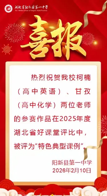 热烈祝贺我校柯楠(高中英语)、甘孜(高中化学)两位老师的参赛作品在2025年度湖北省好课堂评比中,被评为“特色典型课例”。