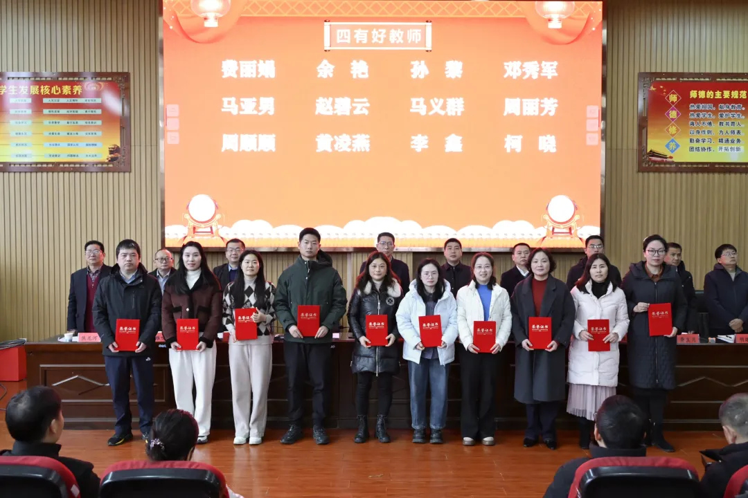 校纪委书记王小宁宣读2026年新春表扬文件,对过去一年在教育教学、管理服务等方面表现突出的先进集体与个人予以表扬,与会领导为获奖教师颁发荣誉并合影留念。