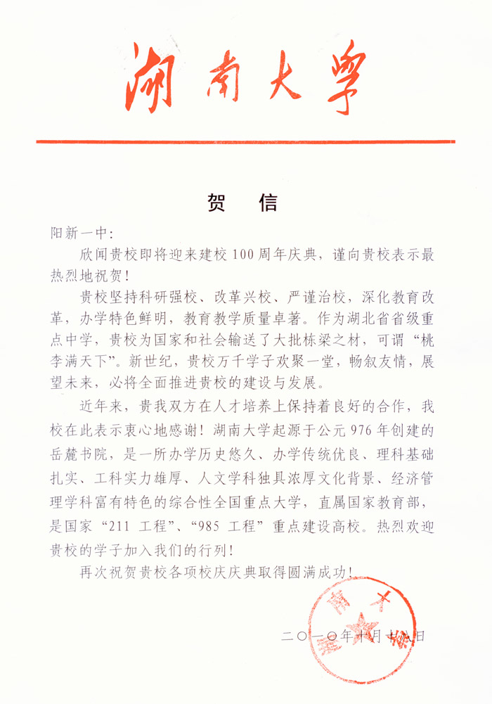湖南大学贺信