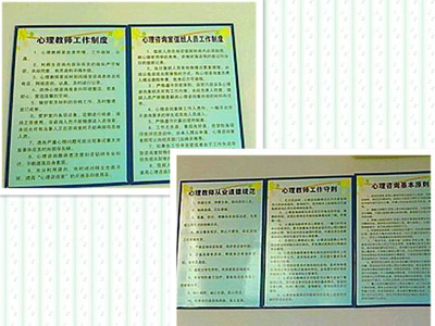 2、为确保工作正常有序进行,咨询室设置了《心理教师工作制度》、《心理教师工作守则》、《心理教师从业道德规范》、《心理咨询基本原则》、《心理咨询室值班人员工作制度》等相关制度。