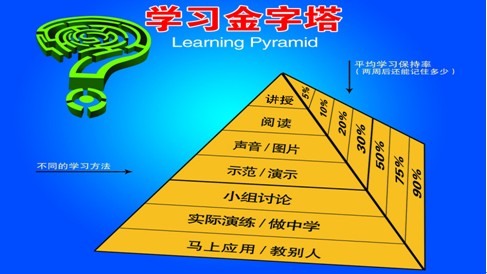 其次,活用教学方法,提倡“自主、合作、探究”。美国国家科学实验室有一个研究成果简称学习金字塔理论,这些数据可以给我们一些启示。