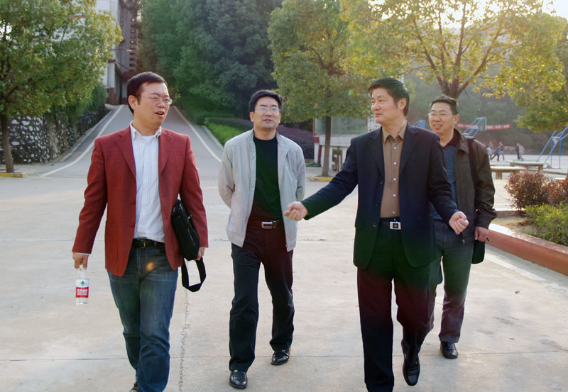 林畅(左一) 与我校校长赵立中(右二)、副校长明道树(左二)、教科室主任陈绪全(右一)一起参观校园、亲切交谈 |