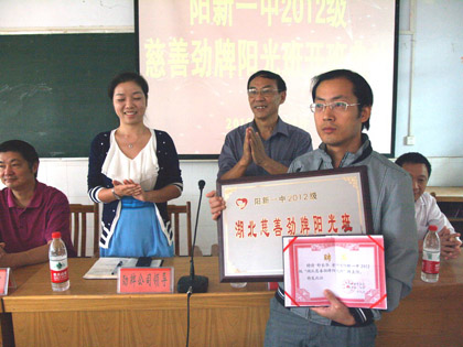 9月14日,阳新一中2012级“慈善劲牌阳光班”开班典礼在教学楼二楼电化教室举行。劲牌公司慈善事业部主管尹琴,阳新慈善总会会长王贤田,阳新慈善总会书记石教义,阳新一中校长赵立中,副校长梁师稳等领导出席了开班典礼。典礼由一中副校长梁师稳主持。