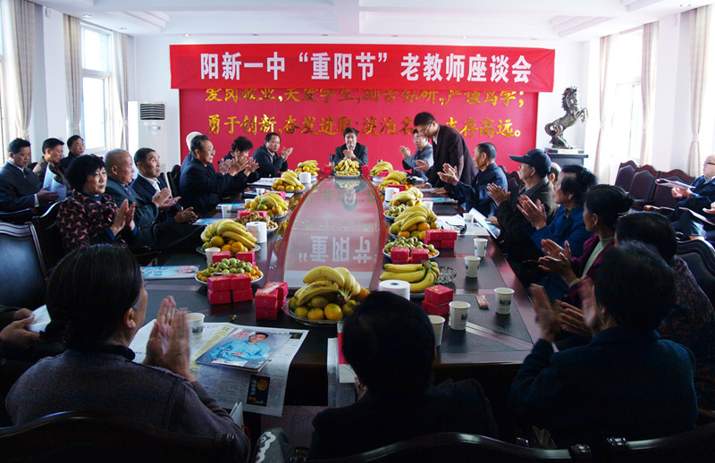 20121023日,秋高气爽,阳光灿烂,阳新一中校园洋溢着节日的喜庆。为隆重纪念重阳节,我校工会在综合楼三楼会议室举办了退休老教师座谈会,全体退休老教师、全体校级领导和工会委员参加了会议。会议由工会主席肖绪曙主持。