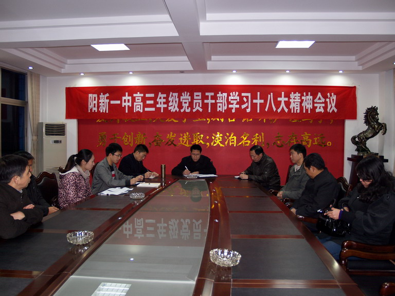2012年11月23号晚上七点,阳新一中高三年级党员干部学习十八大精神会议在综合楼三楼会议室召开,高三年级主要领导和全体党员教师列席参加,会议由年级主任蔡云秀老师主持。