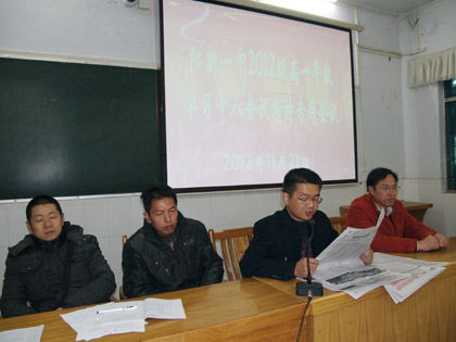 11207时整,高一年级全体党员干部在综合楼三楼会议室召开学习党的“十八大”精神专题会议。会上,梁师稳副校长带领高一年级全体党员干部深入学习党的“十八大”报告。并和与会的党员干部交流心得体会。梁校长说:我们要深刻领会党的“十八大”精神,努力践行科学发展观;我们要坚决维护党的领导和尊严,结合工作实际,稳抓课堂教学,提高学生综合素质;我们要铭记身为教育者的责任和使命,着力提升学生的文化素养和培养学生的社会责任感。李朝忠主任也从工作层面谈了心得体会。李主任说:党员要关注时事,要学习、领会十八大精神,在学习、工作中保持党员的先进性。领会党的“十八大”精神的实质,就是努力做好本职工作。会上,张增春、柯尊发、吴远文等党员老师也分别从不同的角度,深情地畅谈了自己学习党的“十八大”精神的体会。