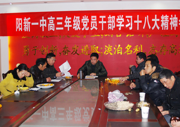 校党总支副书记、副校长明道树做题为《学习十八大,精神不懈怠》的总结讲话。他指出,全体教师尤其是党员教师,一要认真把握十八大精神要领,增强教书育人的政治素养;二是正确认识当前现实,警惕精神懈怠危险;三是增强教书育人责任感,在落实上下功夫。最后,他号召全体教师要在十八大精神的引领下,同心同德,团结一心,为2013年我校再创高考佳绩而勤奋工作!